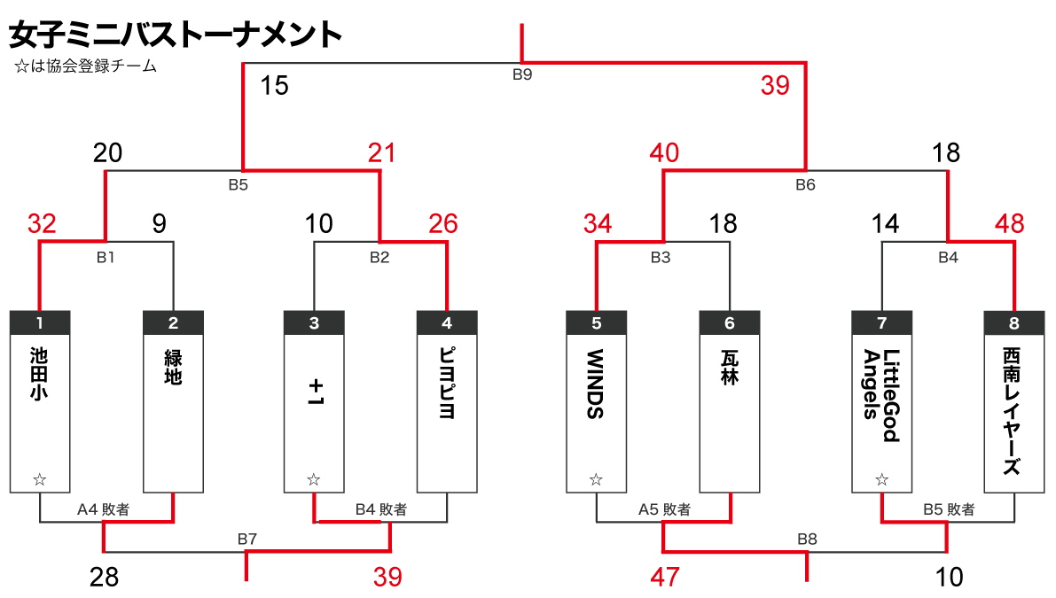 | 12:30 | 5 | B1勝ち vs B2勝ち | Angels・西南レイヤーズ | B4負け |