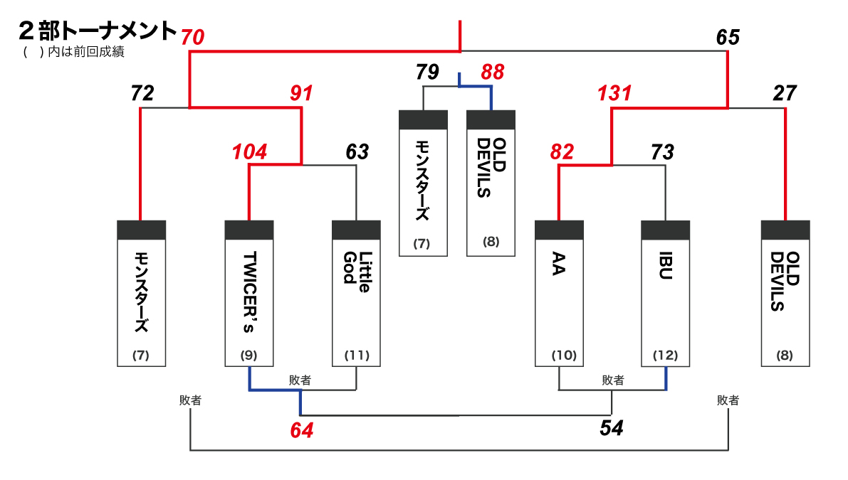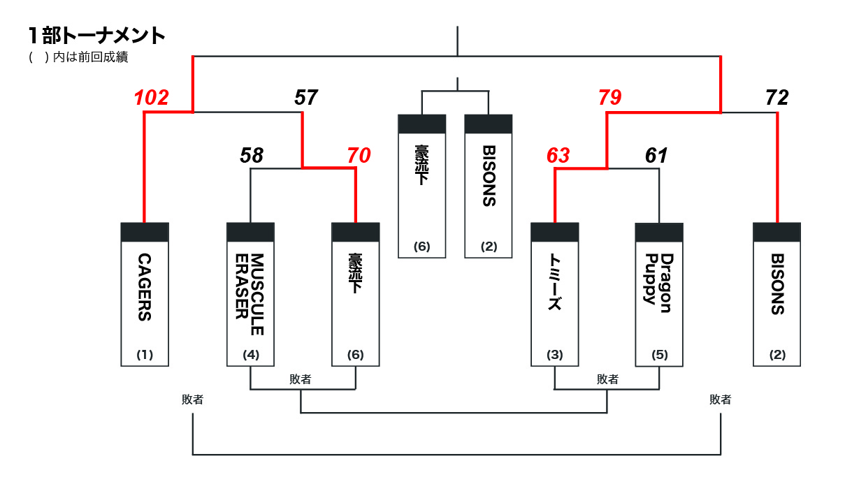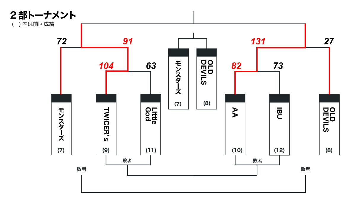 | 4 | 14:00 | 1日目A②の勝者 vs BISONS | 1日目A③の2チーム | 1日目B②の勝者 vs OLD DEVILS | 1日目B③の2チーム |